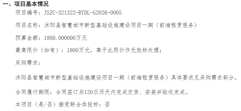 近日,由沭阳县公安局作为采购人的“智慧城市新型基础设施建设项目一期(前端租赁服务)”正式发布招标公告,项目预算金额1800万元,投标截止时间为2026年4月1日。